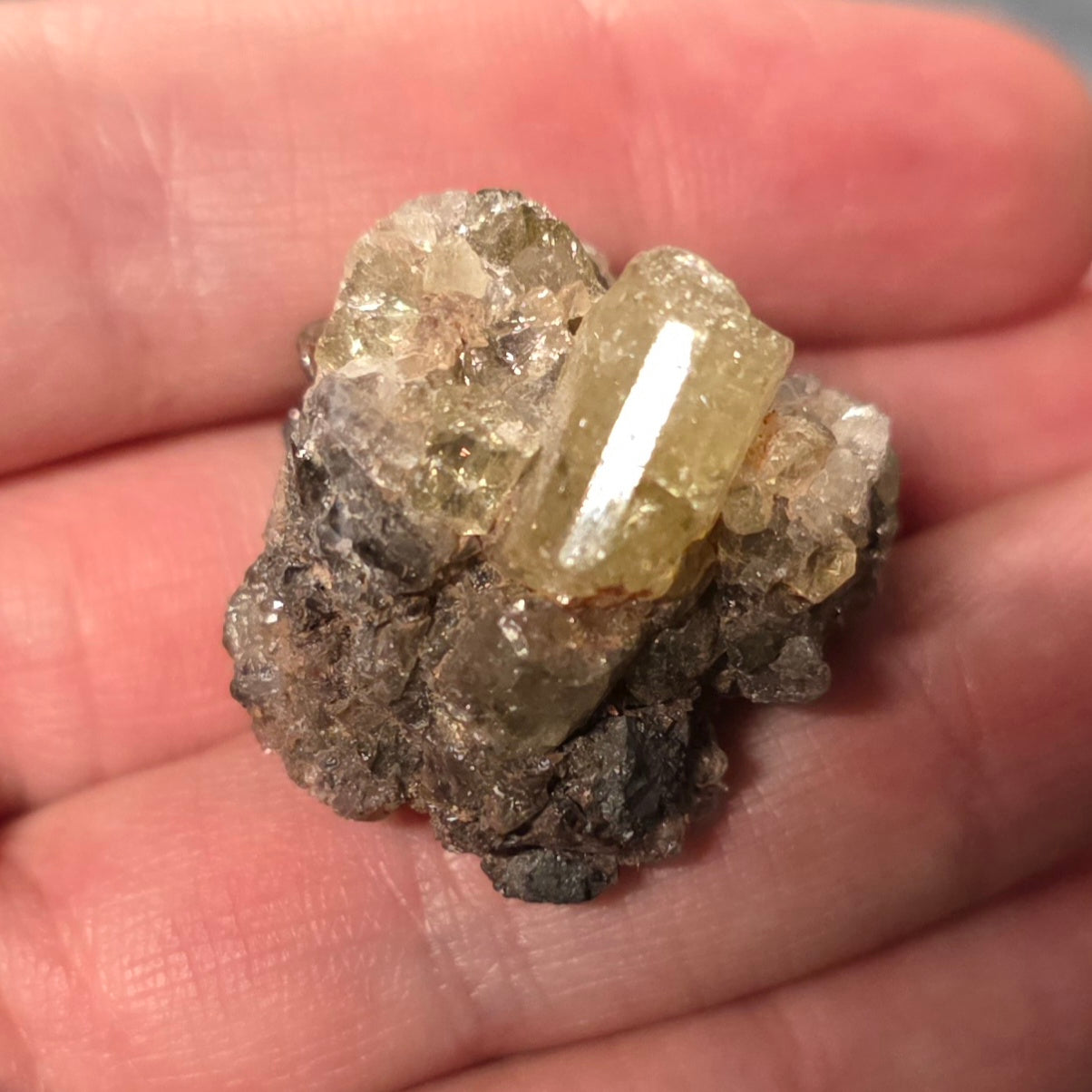 The matrix (stone containing the apatite crystals) measures 1.25" long and we can ship this worldwide.