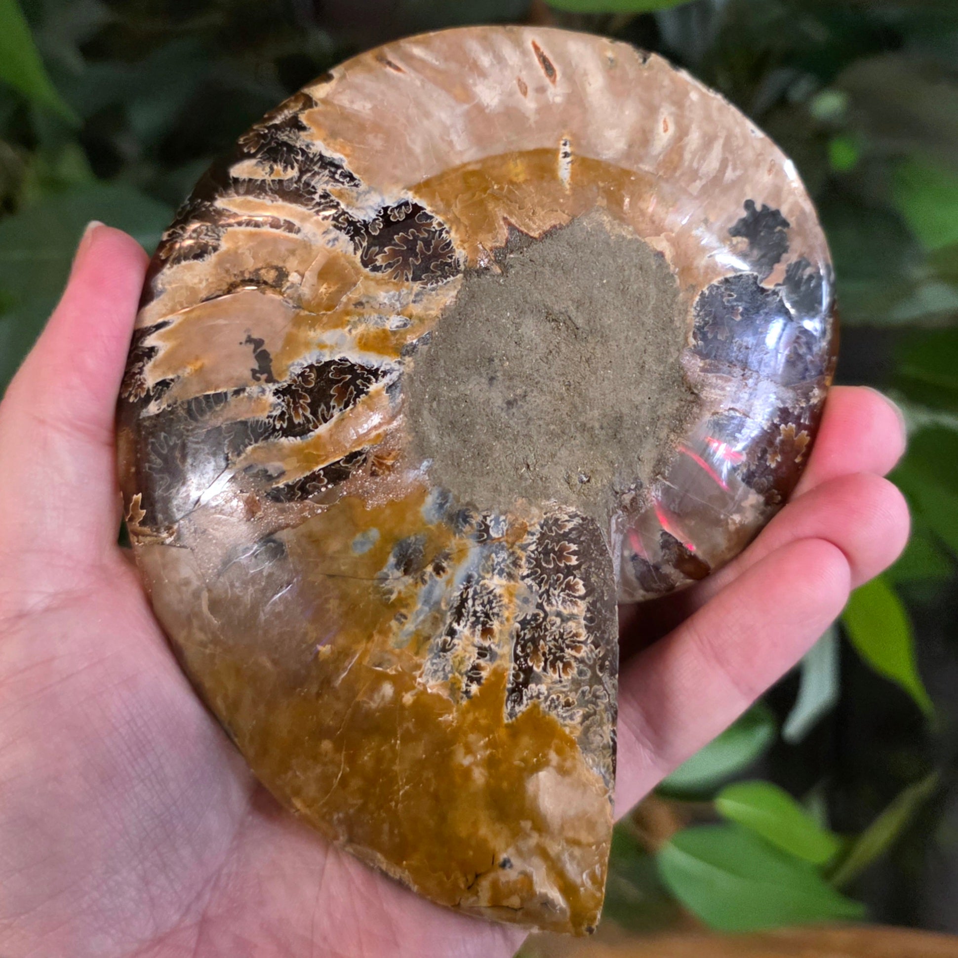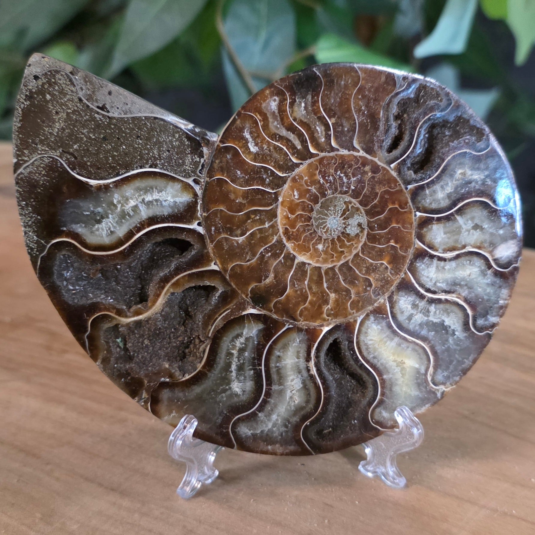 Madagascar Cleoniceras ammonite fossil for sale! These bisected ammonites date back to the Cretaceous period and were found in Madagascar! Though they are more closely related to coleoids (squid, octopus, etc), these extinct critters resemble the modern day nautilus - their shells are also filled with spiralling chambers that aided in controlling their buoyancy.