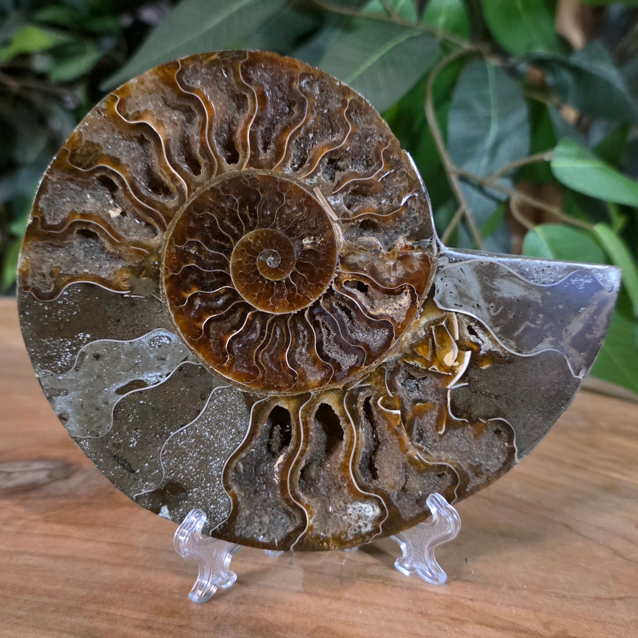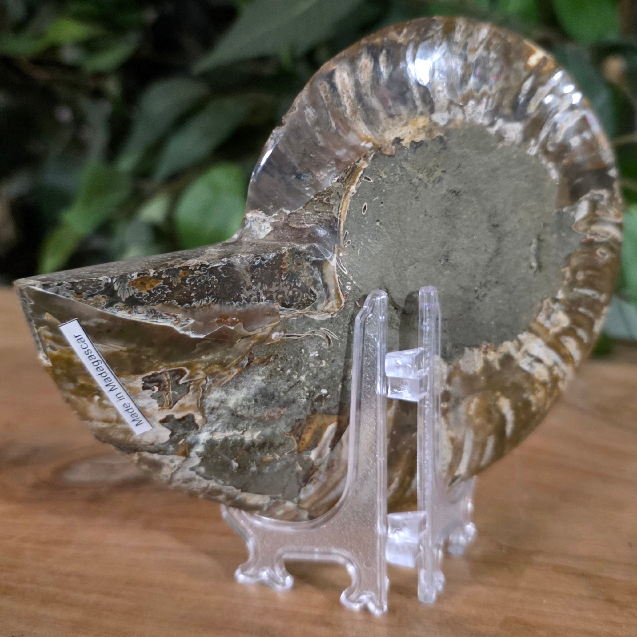 Madagascar Cleoniceras ammonite fossil for sale! These bisected ammonites date back to the Cretaceous period and were found in Madagascar! Though they are more closely related to coleoids (squid, octopus, etc), these extinct critters resemble the modern day nautilus - their shells are also filled with spiralling chambers that aided in controlling their buoyancy.