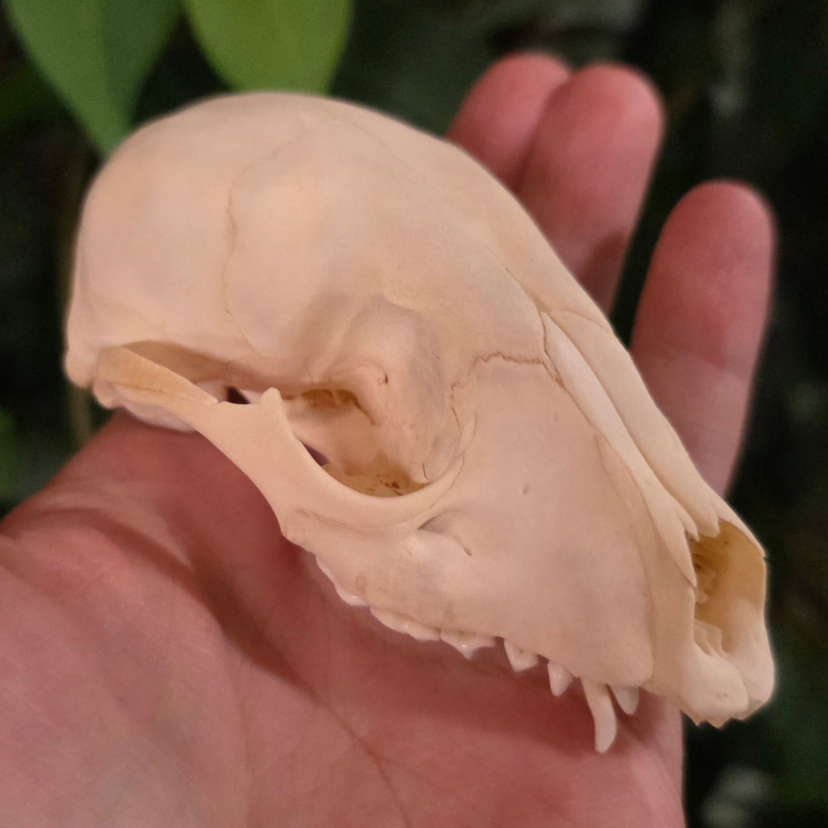 This skull has no jaw, and is missing teeth. It has been discounted. It is also a subadult, showing infant canine teeth!