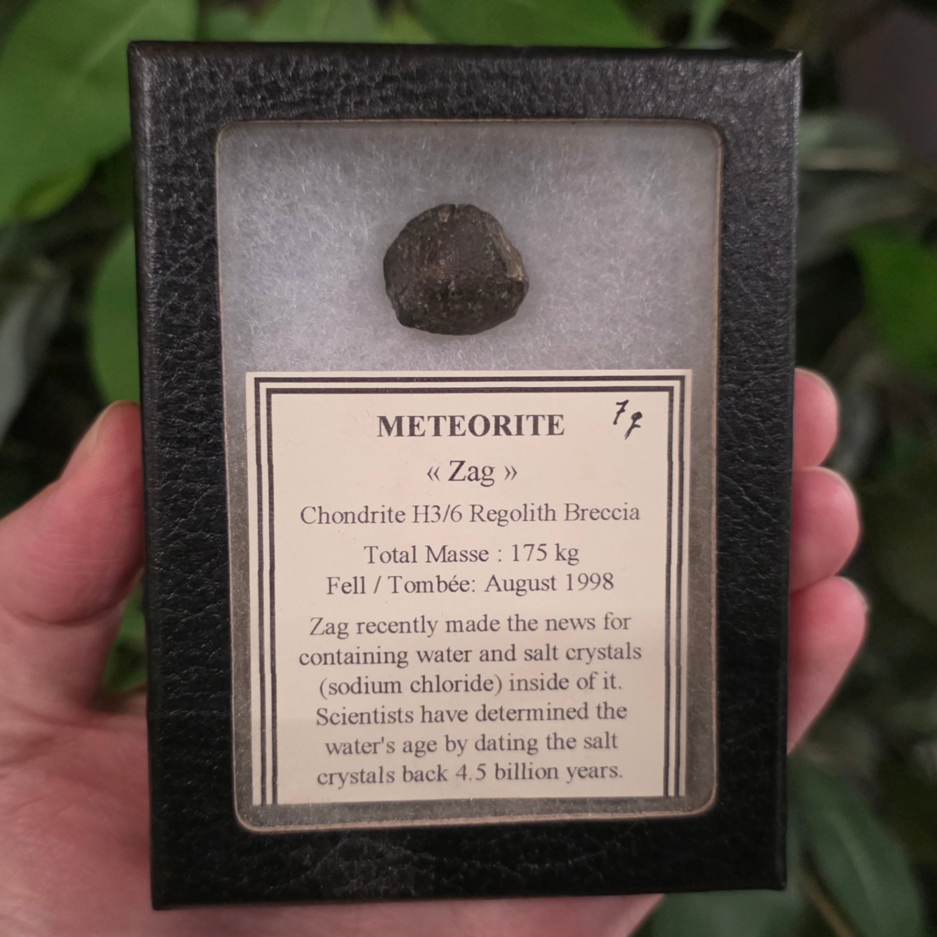 The Zag meteorite is an H3-6 regolith breccia ordinary chondrite. It is a significant observed fall that occurred in August 1998 near Zag, Morocco, and is notable for containing rare, ancient halite (salt) crystals with fluid inclusions of liquid water.