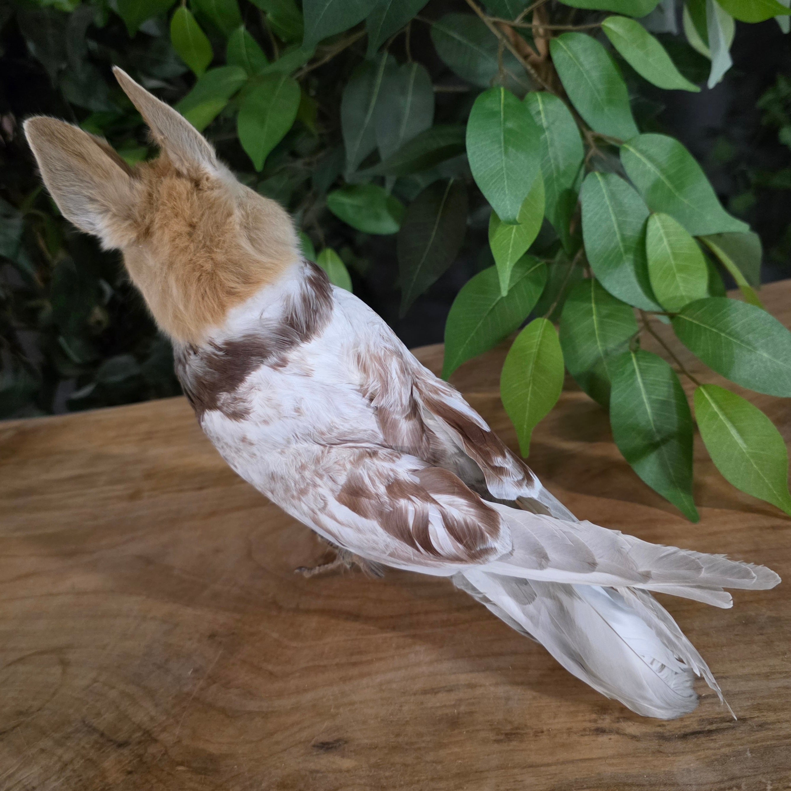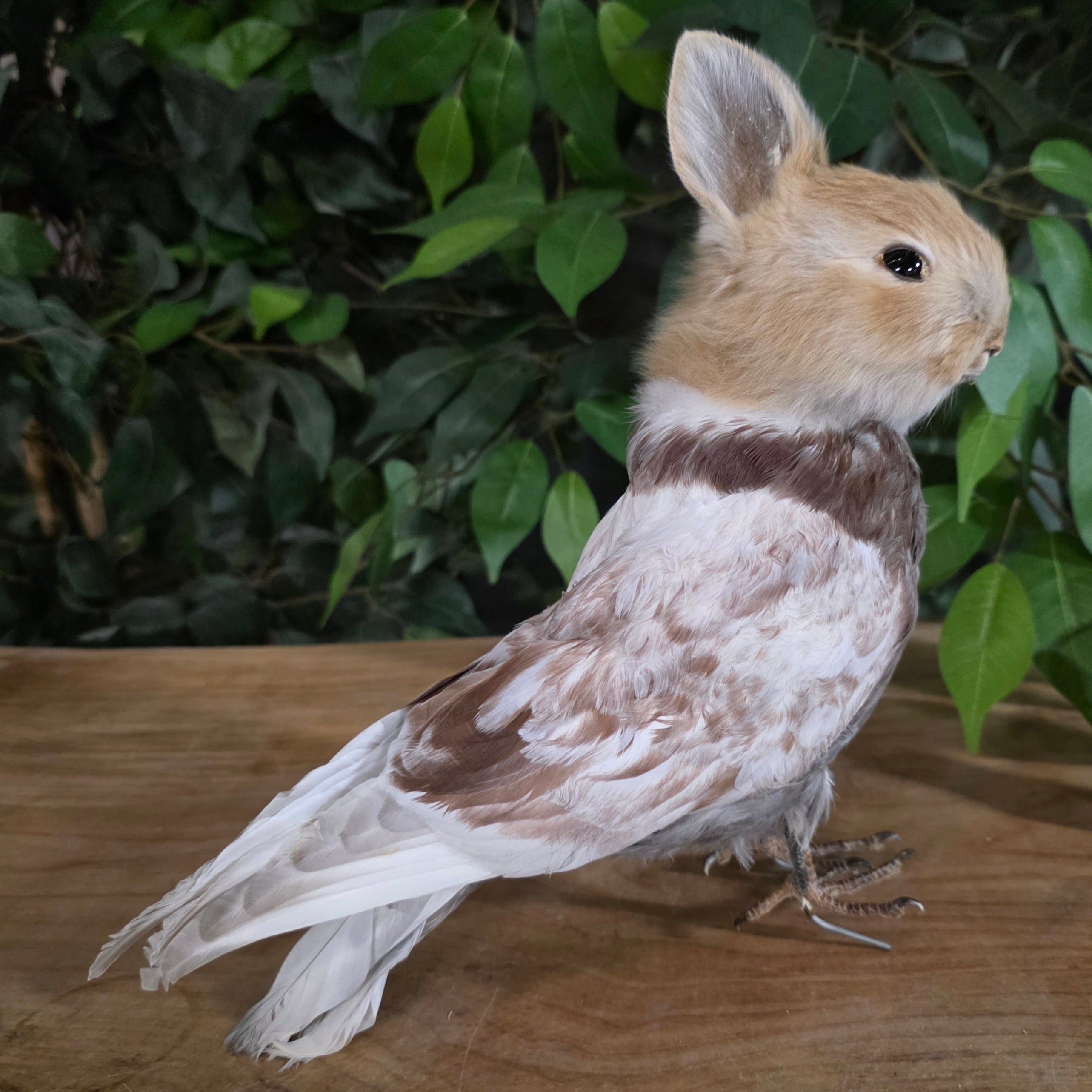 Taxidermy birdbun mount for sale! This sideshow-style fictional animal was made using real pigeon and bunny parts.