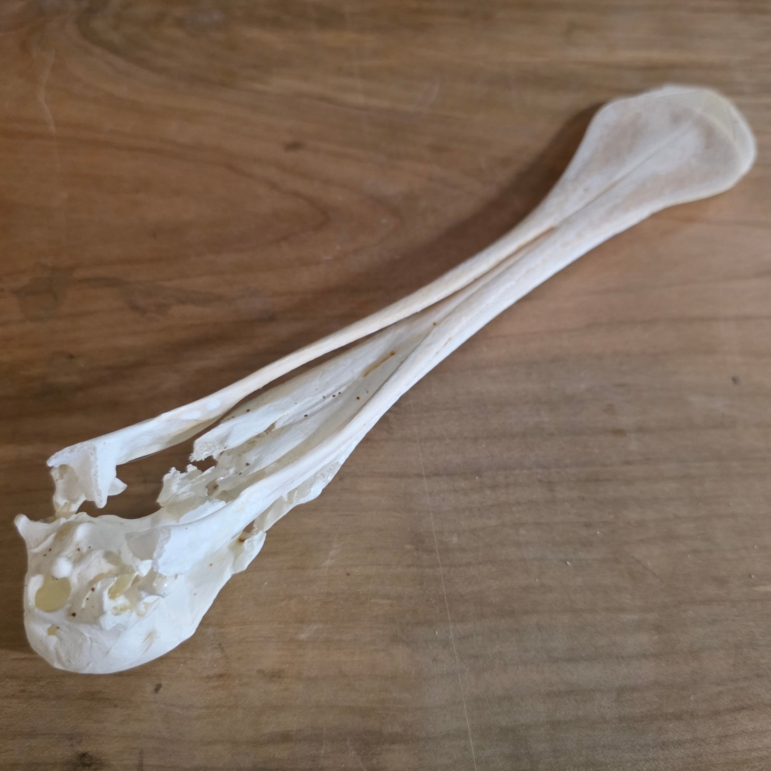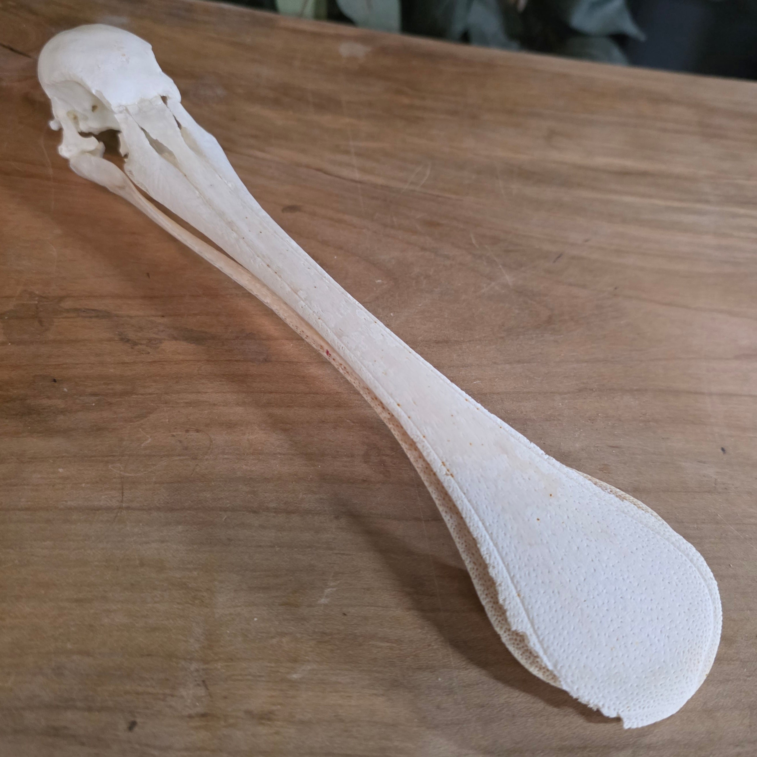 This is the skull of an African spoonbill! These bizarre birds, closely related to Ibis, are famous for their spoon-shaped bill structure. Indigenous to Africa and Madagascar, they hunt in shallow waters and feed upon fish, mollusks, larvae and insects.
