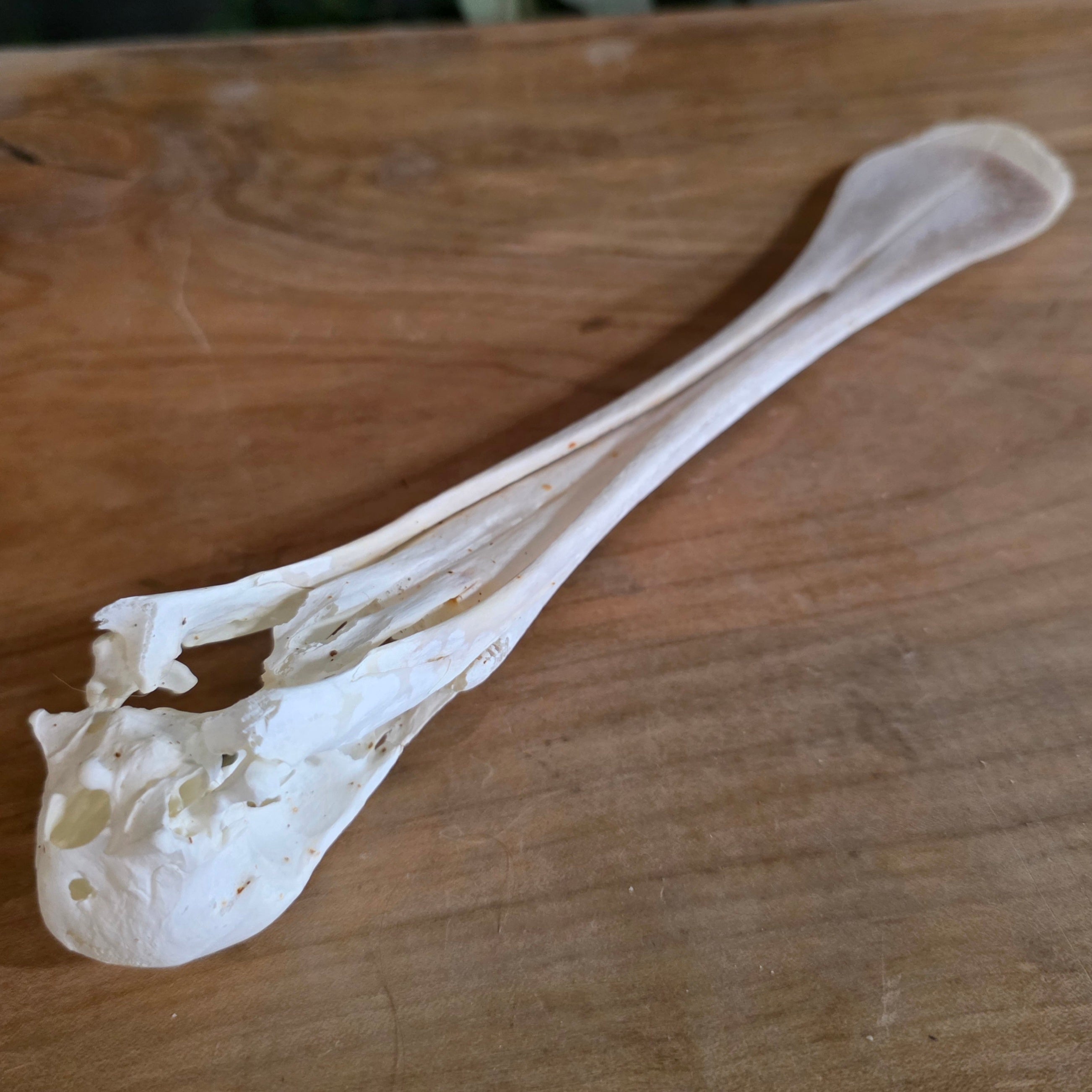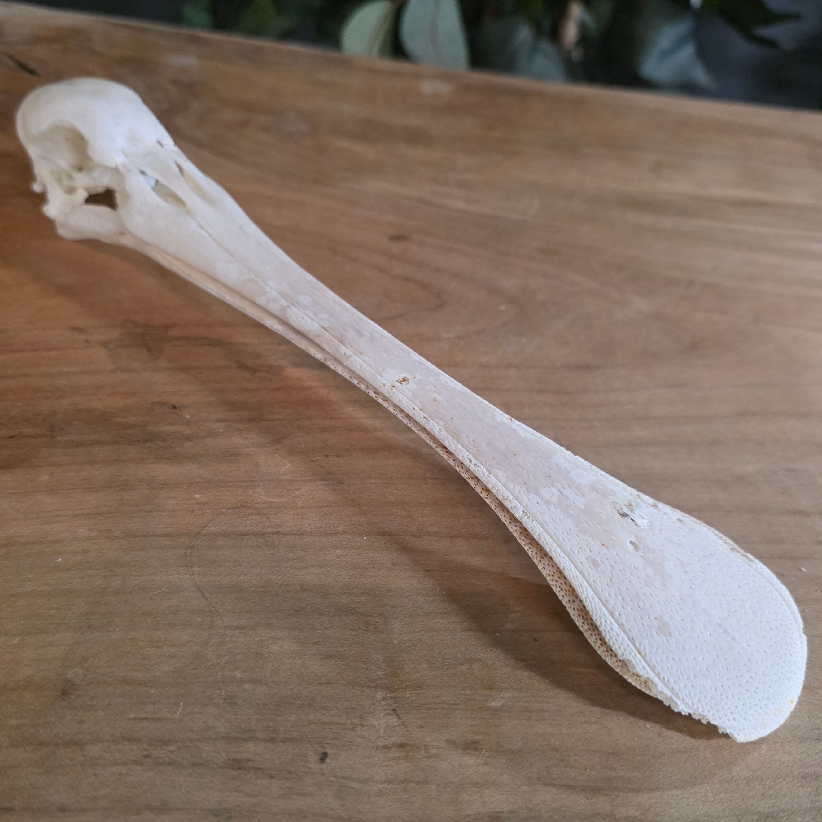 This is the skull of an African spoonbill! These bizarre birds, closely related to Ibis, are famous for their spoon-shaped bill structure. Indigenous to Africa and Madagascar, they hunt in shallow waters and feed upon fish, mollusks, larvae and insects.