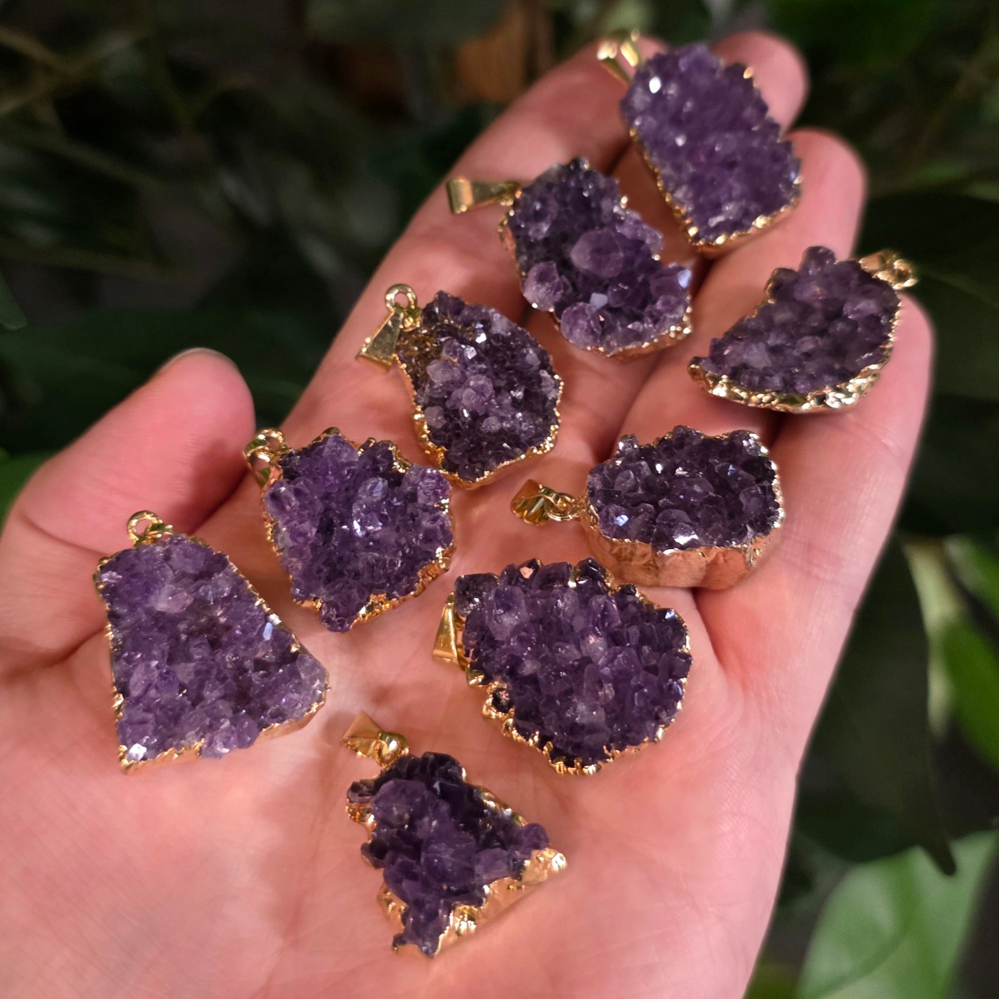 Amethyst crystal pendants for sale! These are real, beautiful, Brazilian amethyst crystal clusters with pendant attachments!