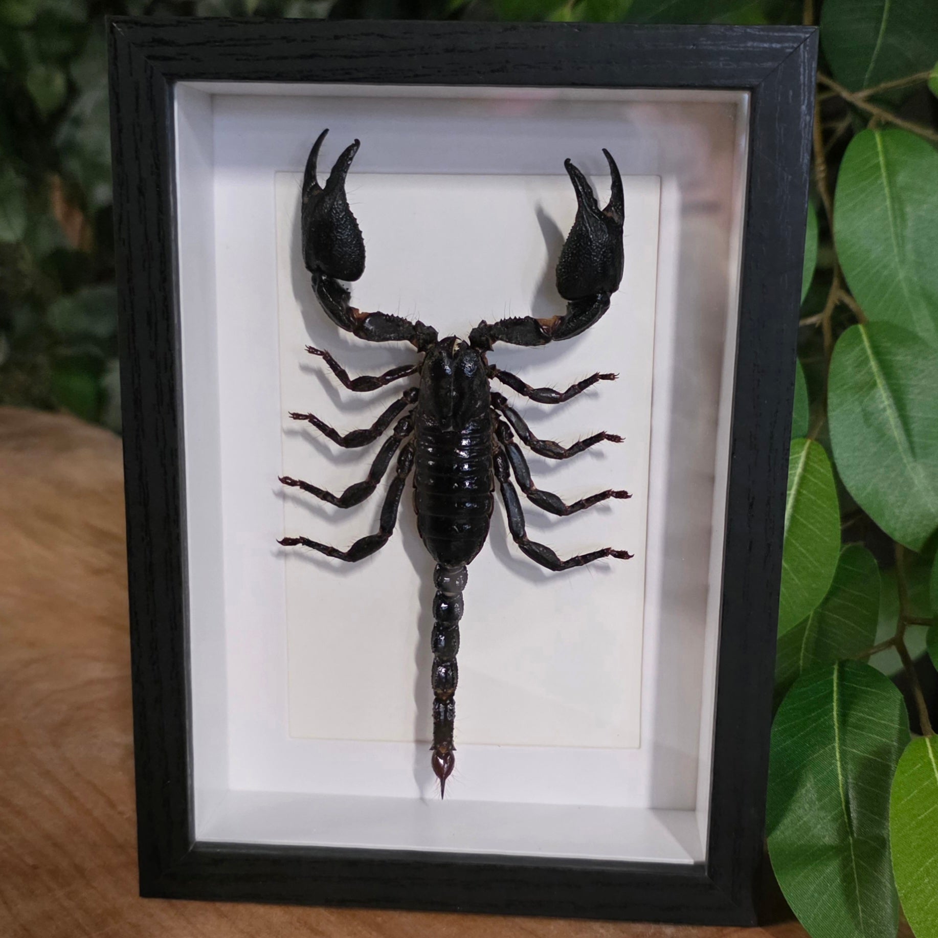 Real Blue Forest Scorpion (Heterometrus cyaneus) for sale! It has been mounted in a 8"x6" shadowbox. THEY CAN BE SHIPPED WORLDWIDE!