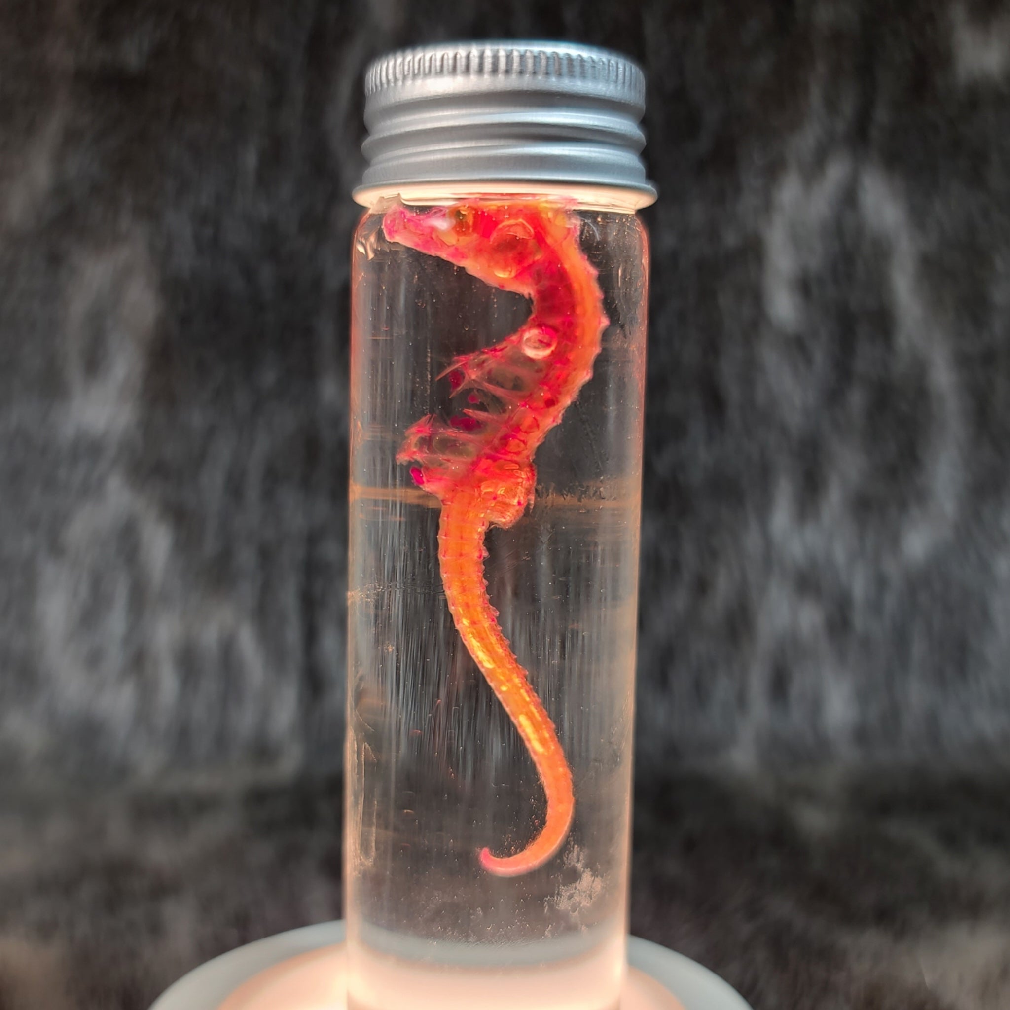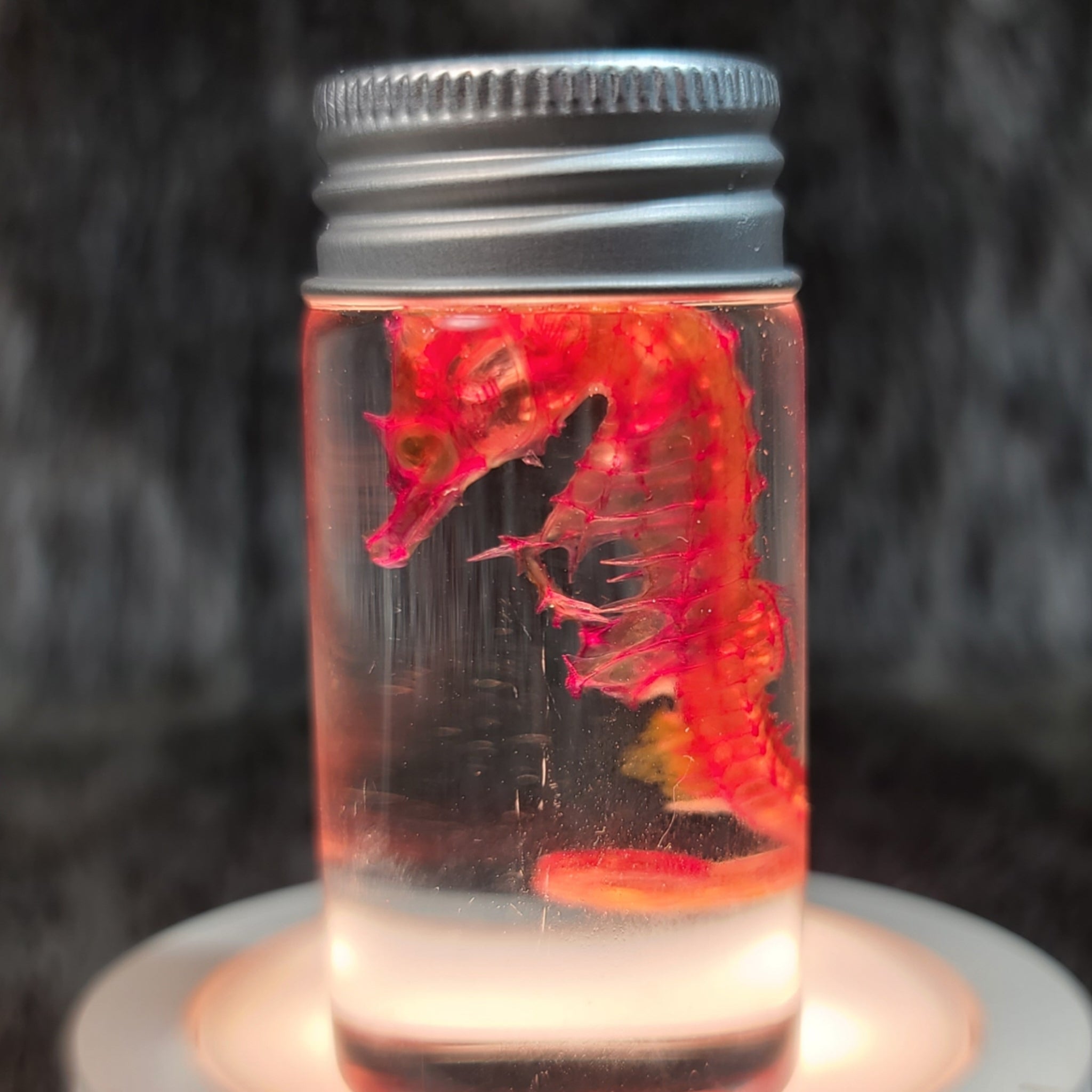 The skin and muscles are translucent, and a dye helps reveal what lies beneath! This seahorse wet specimen is an incredible piece of anatomical reference. These come in two different sized jars, ~2.5" and 4" tall.