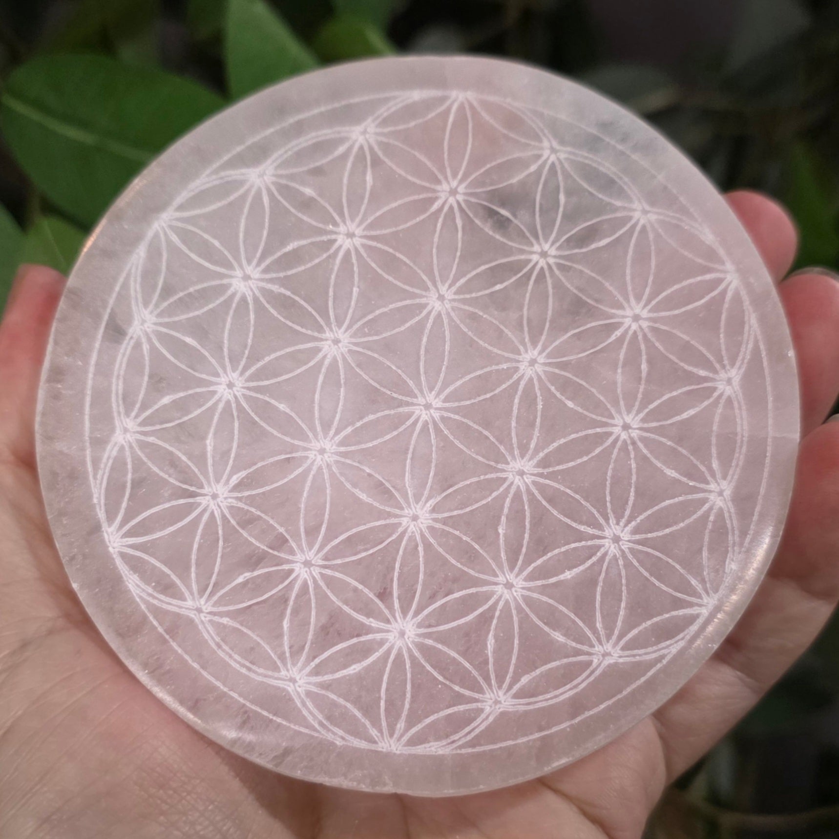 Selenite spiritual Flower of Life Disks for sale. These are celestial disks, carved out of selenite!