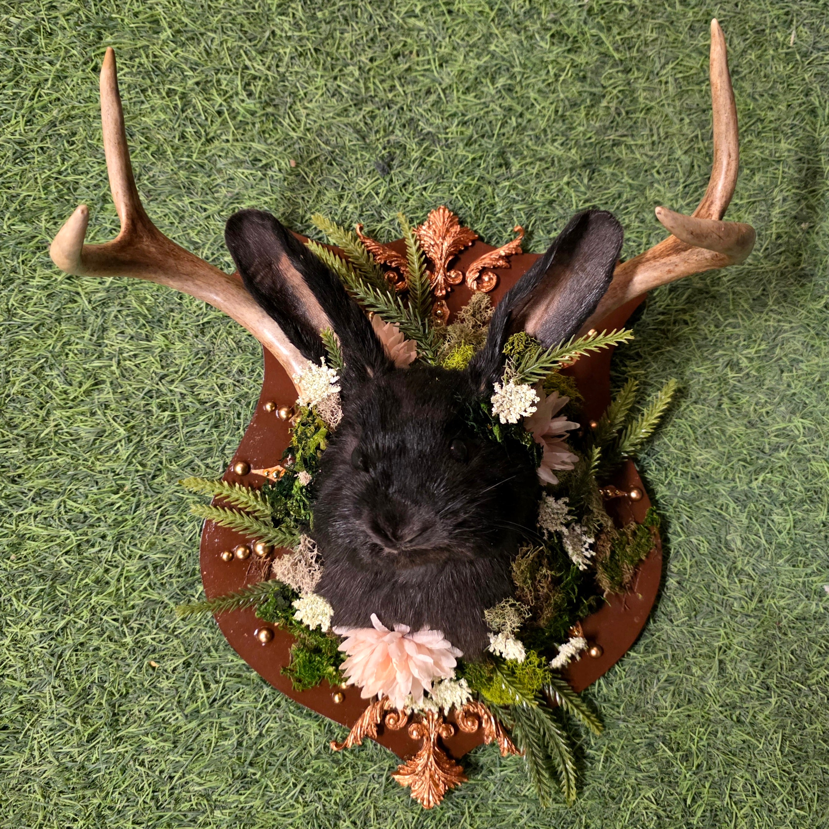 Jackalope taxidermy mount for sale! This mythical creature was made with real rabbit fur and a set of real deer antlers.