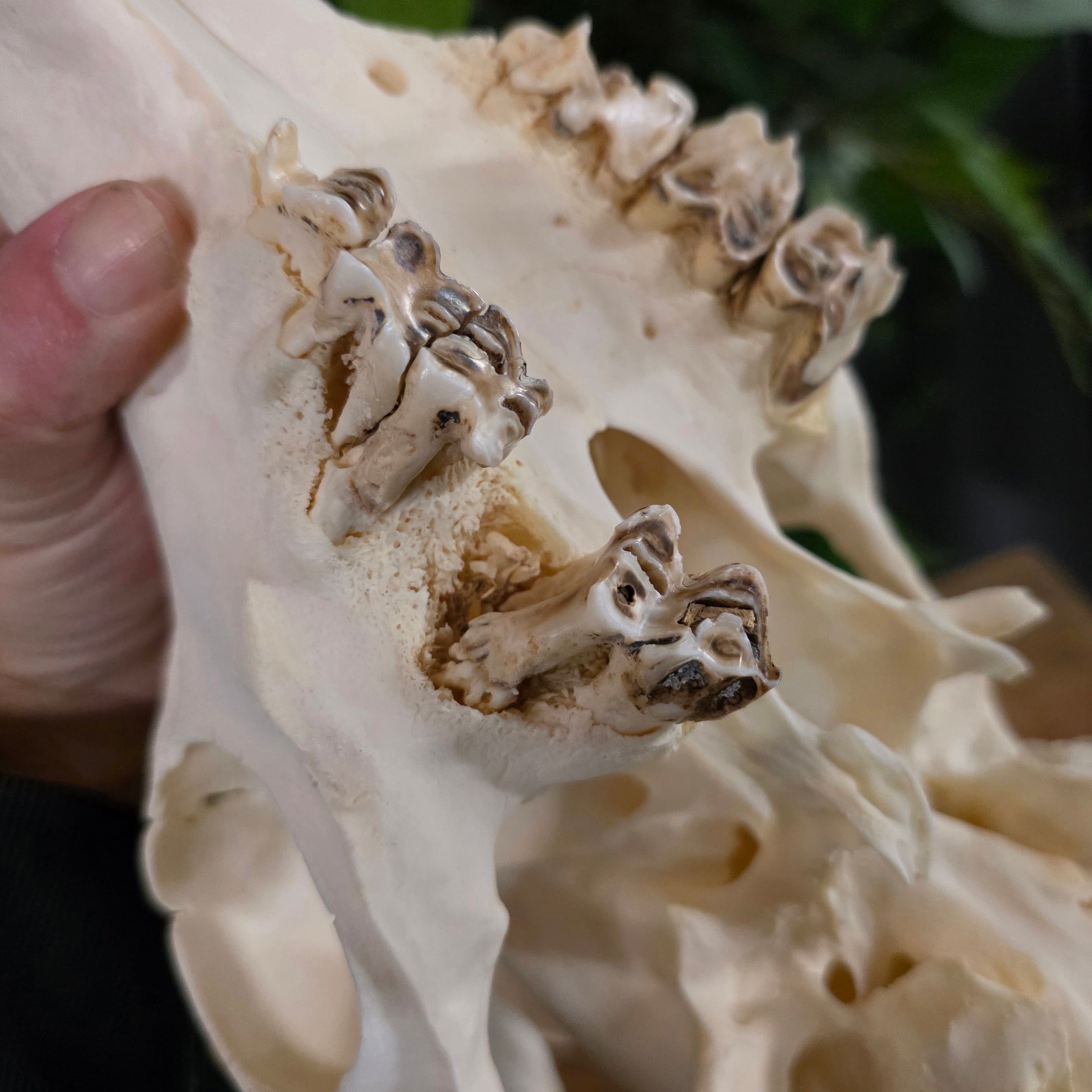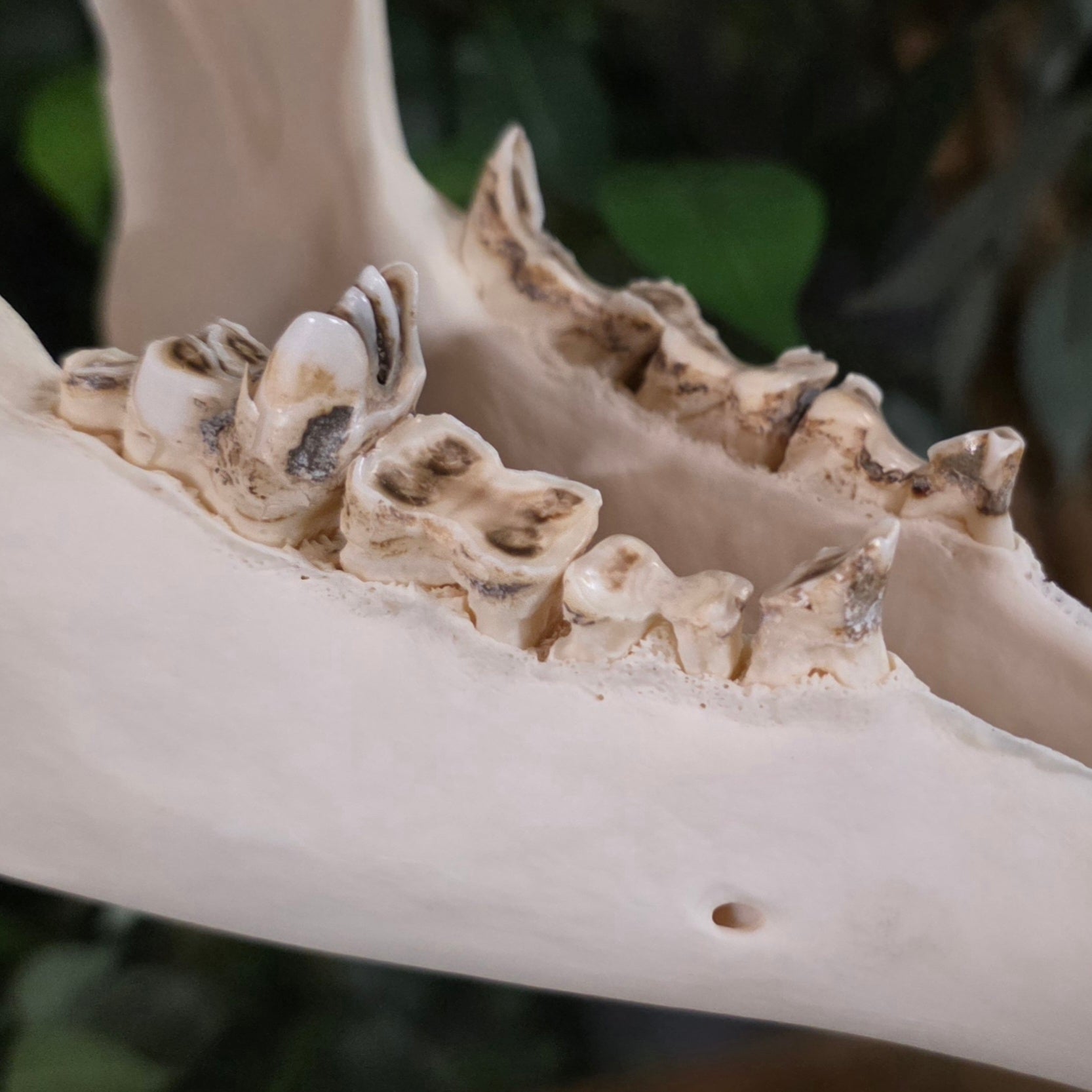 This llama skull is exhibiting extreme dental pathology -  not only does it have significant tooth wear, it suffered a major infection that even consumed a large portion of bone from one side of the mouth!